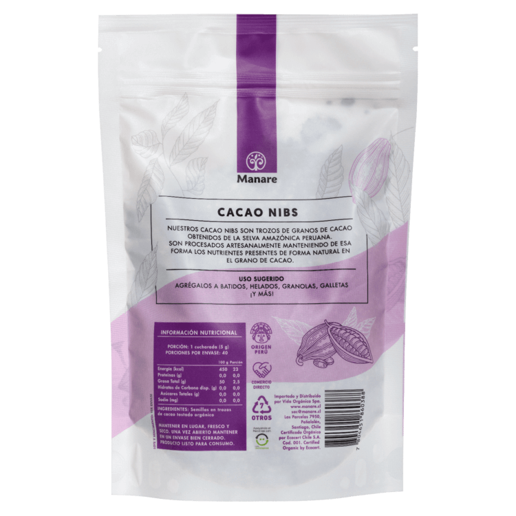 Trozos de cacao puro, perfectos para snacks, cereales y postres. Fuente natural de antioxidantes y energía.