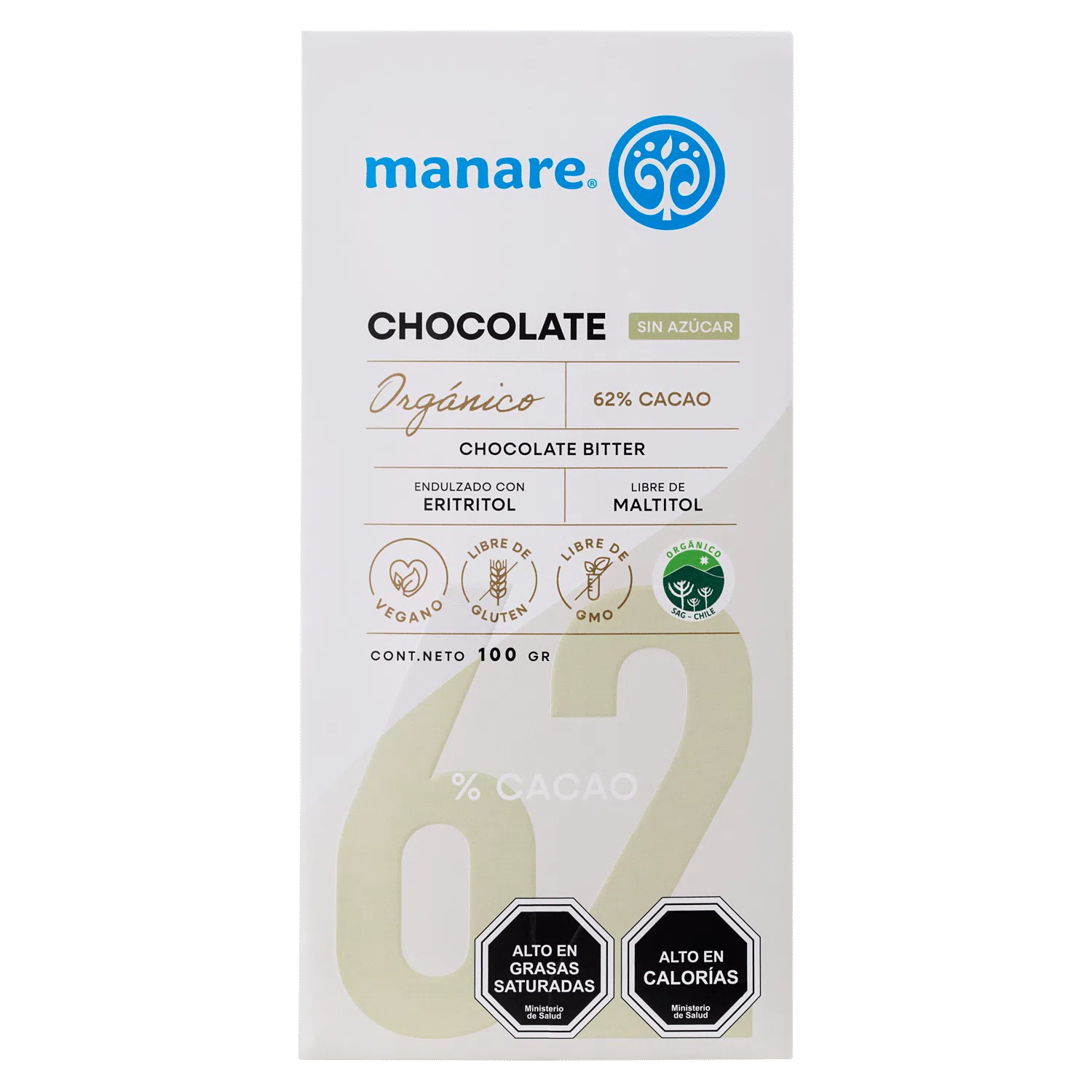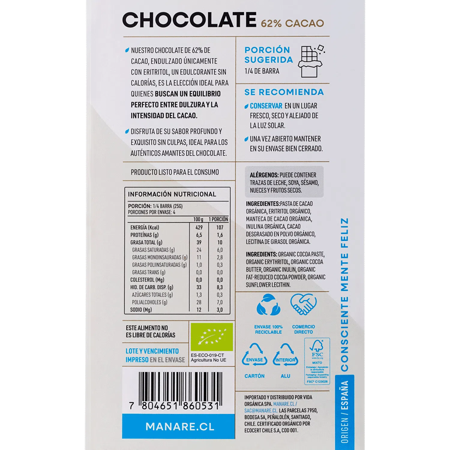 Tableta de chocolate orgánico sin azúcar, con 62% de cacao. Una alternativa deliciosa y saludable para disfrutar sin culpa.