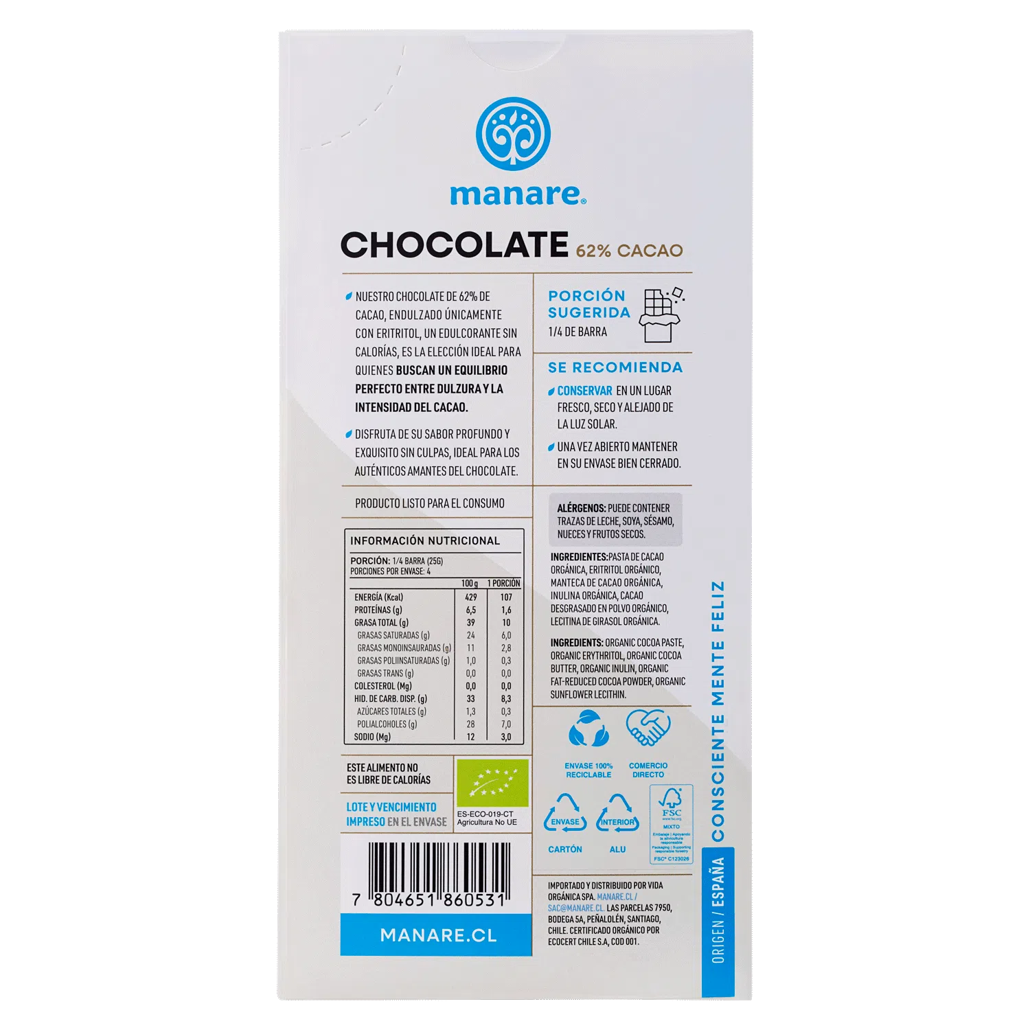 Chocolate sin azúcar 62% cacao orgánico 100 g