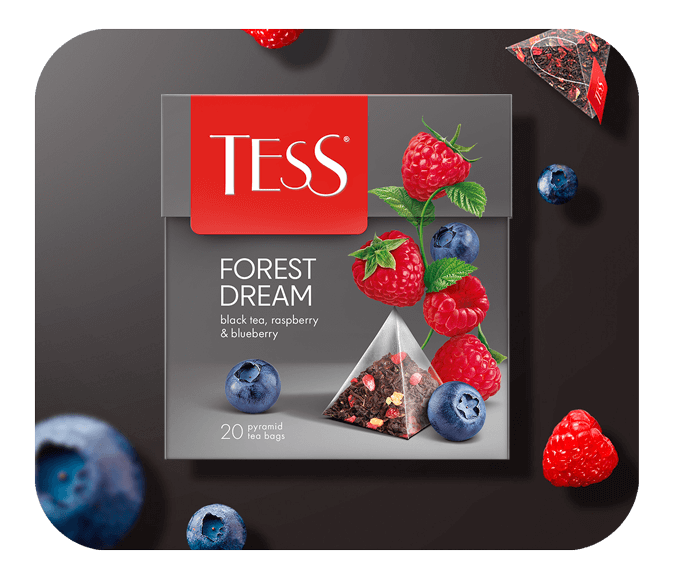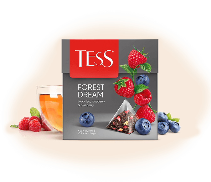 Forest Dream, el cálido aliento del bosque. Una mezcla clásica de té negro complementada con aromáticas frutas del bosque: frambuesas y arándanos.